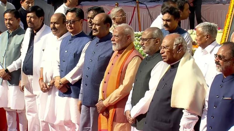 लोकसभा अध्यक्ष ओम बिरला, केंद्रीय संसदीय कार्य मंत्री किरेन रिजिजू, संसदीय कार्य राज्य मंत्री अर्जुन राम मेघवाल, राज्यसभा सदस्य रामदास अठावले और कांग्रेस नेता उदित राज सहित कई अन्य लोग भी 'संविधान के जनक' को श्रद्धांजलि देने के लिए संसद पहुंचे। इस दौरान, पीएम मोदी और कांग्रेस के राष्ट्रीय अध्यक्ष मल्लिकार्जुन खड़गे के बीच हल्की-फुल्की बातचीत भी हुई।