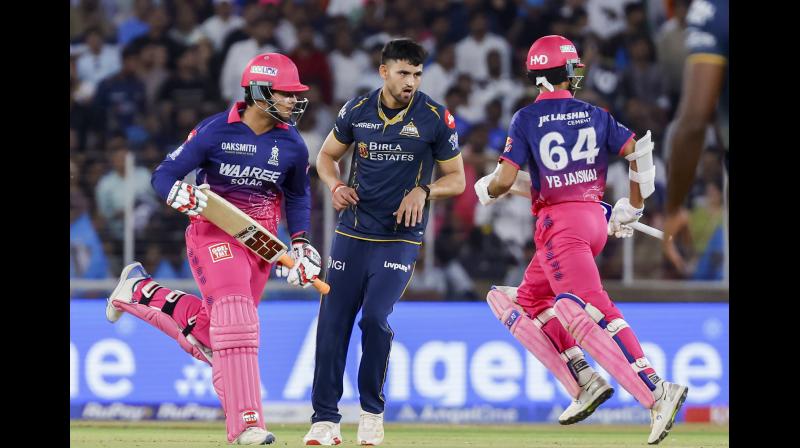 वैभव 18 गेंदों में 1 छक्के और 5 चौकों के साथ 31 रन बनाकर आउट हुए, जिसके बाद जायसवाल ने ध्रुव जुरेल के साथ दूसरे विकेट के लिए 37 गेंदों में 56 रन की साझेदारी की। जायसवाल ने 36 गेंदों में 55 रन बनाए। उनकी इस पारी में 3 छक्के और 6 चौके शामिल रहे, जबकि जुरेल ने 42 गेंदों में 5 छक्कों और इतने ही चौकों की मदद से 75 रन टीम के खाते में जोड़े। गुजरात टाइटंस के खेमे से कगिसो रबाडा ने 2 विकेट हासिल किए, जबकि मोहम्मद सिराज, अशोक शर्मा, प्रसिद्ध कृष्णा और राशिद खान ने 1-1 विकेट अपने नाम किया।