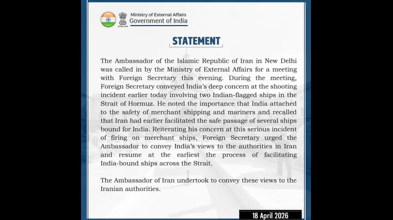 नई दिल्ली, 18 अप्रैल । भारत ने होर्मुज स्ट्रेट में दो भारतीय जहाजों पर हुई फायरिंग को लेकर प्रतिक्रिया दी है। विदेश मंत्रालय ने एक बयान जारी कर भारत का पक्ष रखा है।